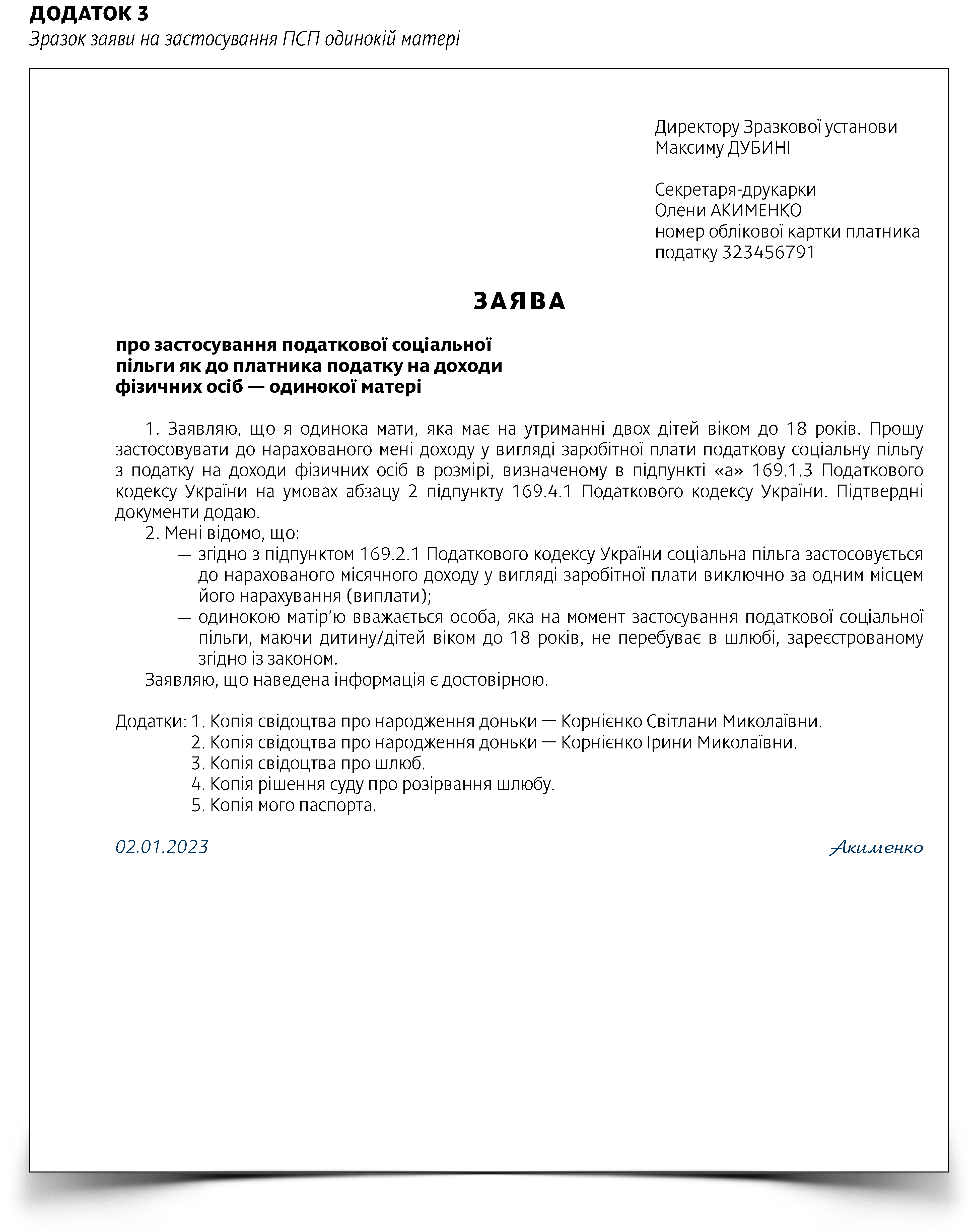 Заява про застосування податкової соціальної пільги як платника податку на доходи фізичних осіб ― одинокої матері